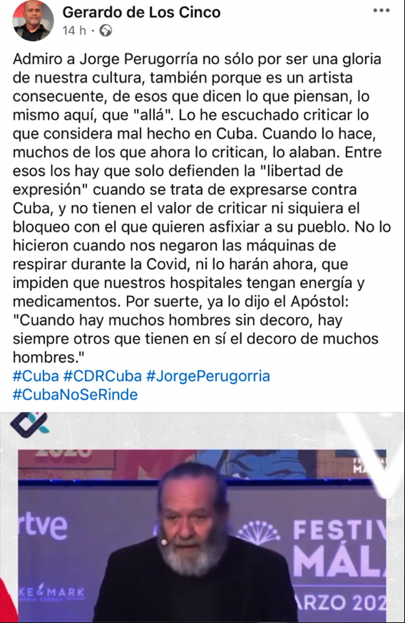 “Admiro a Jorge Perugorría no sólo por ser una gloria de nuestra cultura, también porque es un artista consecuente, de esos que dicen lo que piensan, lo mismo aquí que allá”, escribió el funcionario del régimen.