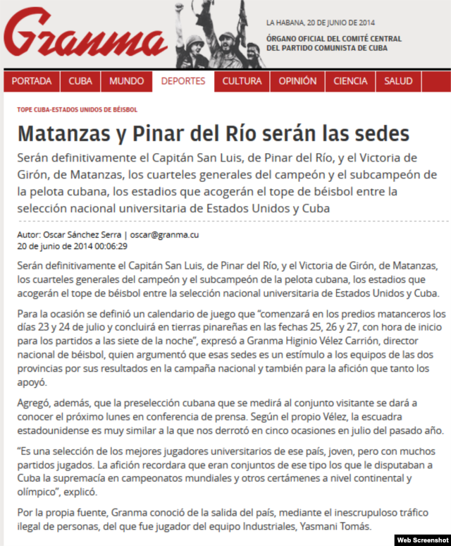 La noticia aparece al pie de una nota informativa del diario Granma acerca de un encuentro amistoso entre los equipos universitarios de Cuba y EEUU.