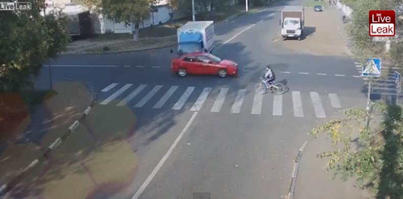 En la ciudad rusa de Liúbertsy, cerca de Moscú, un hombre parece haberse ganado el título de ciclista más afortunado de Rusia o, quizás, del mundo entero. Y es que mientras cruzaba la calle a baja velocidad y por un paso de cebra un camión y un coche han sufrido una fuerte colisión.