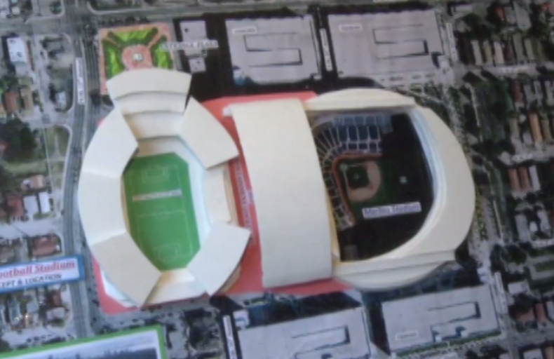 El comisionado del condado Miami Dade Xavier Suárez propuso un diseño para construir un estadio de fútbol junto al estadio de los Marlins.