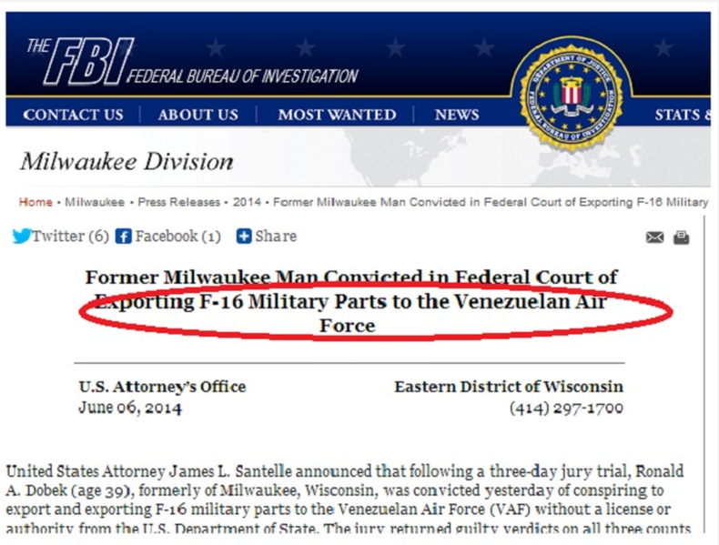 La nota del FBI informó que Dobek envió a Venezuela, en diciembre de 2007 y diciembre de 2008, el material para el sellado de la cabina de aviones F-16. En el juicio, fueron analizadas copias de correos electrónicos entre Dubek y un militar venezolano no identificado sobre la compra y envío de los componentes.